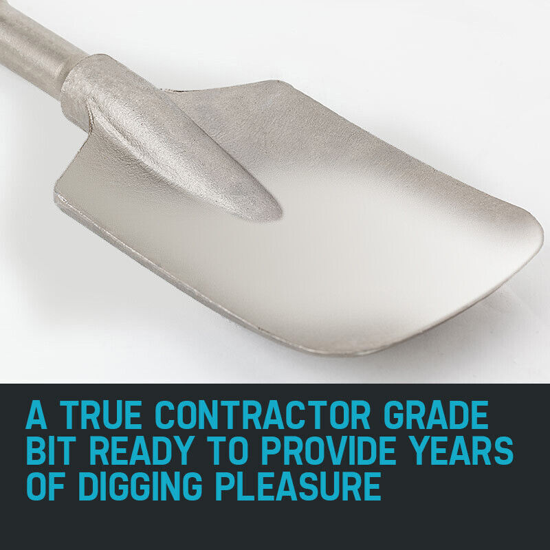 This extra-wide 140mm square-tip clay jack hammer bit turns your jackhammer into a powered mega spade! This type of gouge is best suited for hard soil that bends ordinary shovels - time to get your own ultimate jack hammer chisel bit! The full 140mm width and super thick spade base means you only ever need to buy one of these. Resharpen time after time with plenty of meat. A true contractor grade bit ready to provide years of digging pleasure!