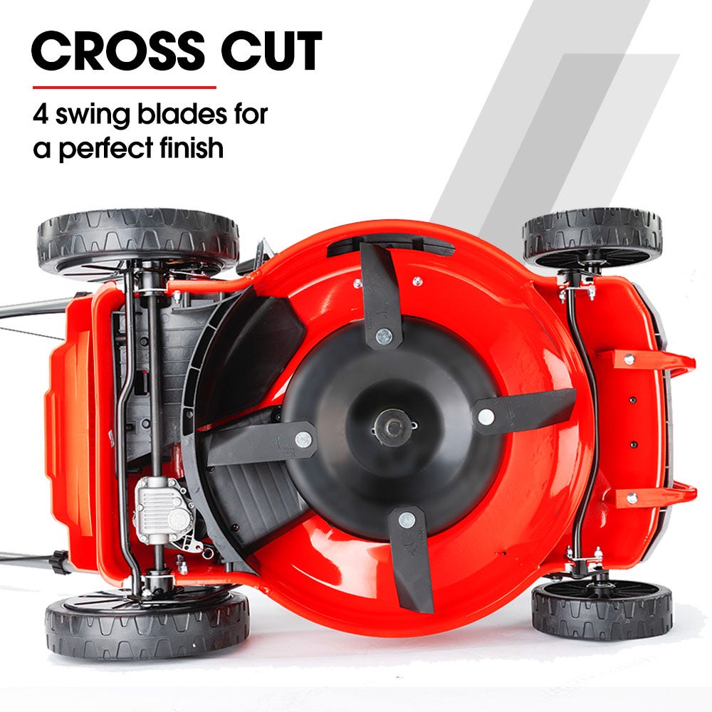 Enjoy 8 adjustable cutting heights (25mm–75mm) for a perfect finish. Four swing-back blades provide a clean cut and handle debris impact. It has a large 55L catcher for less frequent emptying. The high-efficiency air filter boosts engine performance and reduces emissions.