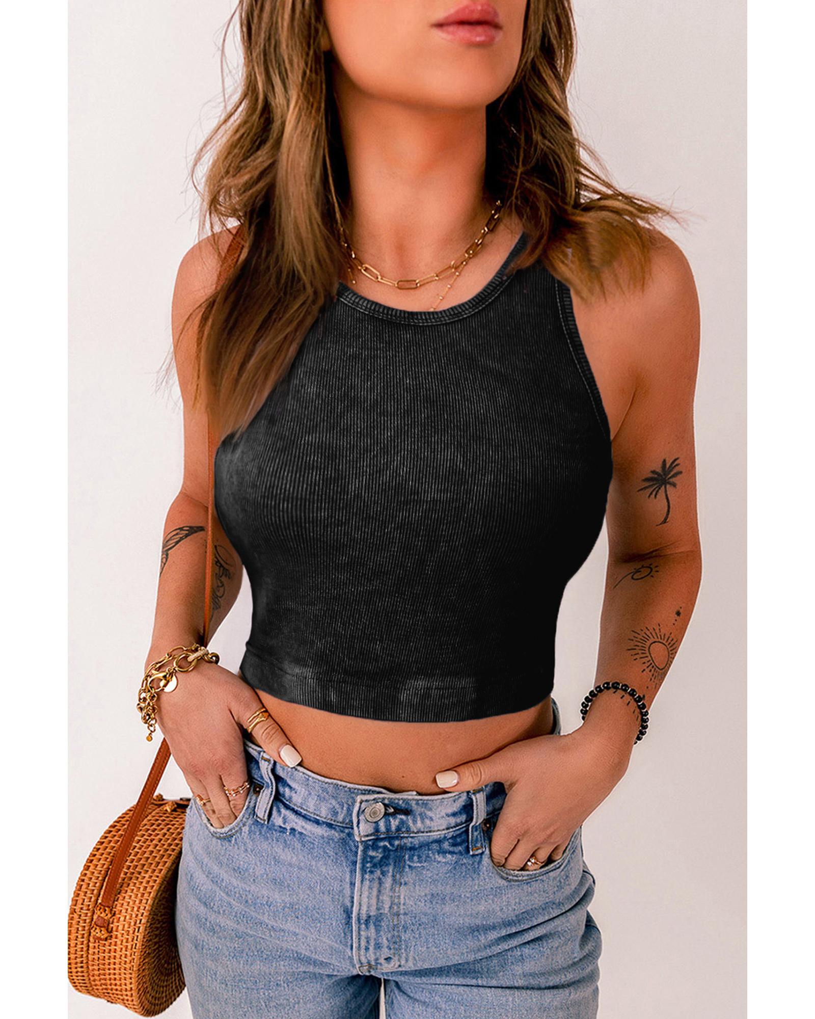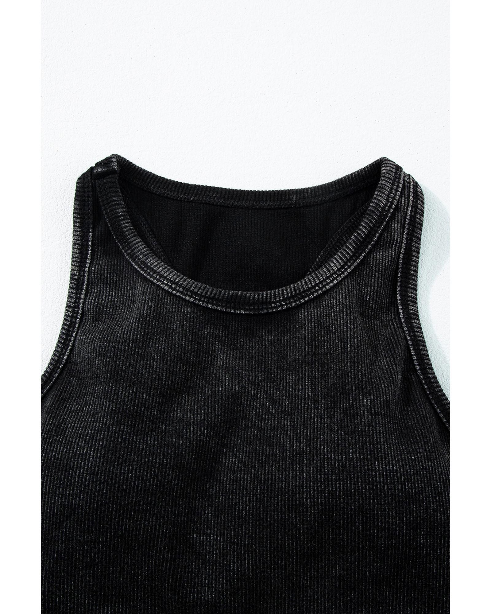 Black Ribbed Mineral Wash Racerback Cropped Tank Top - XL