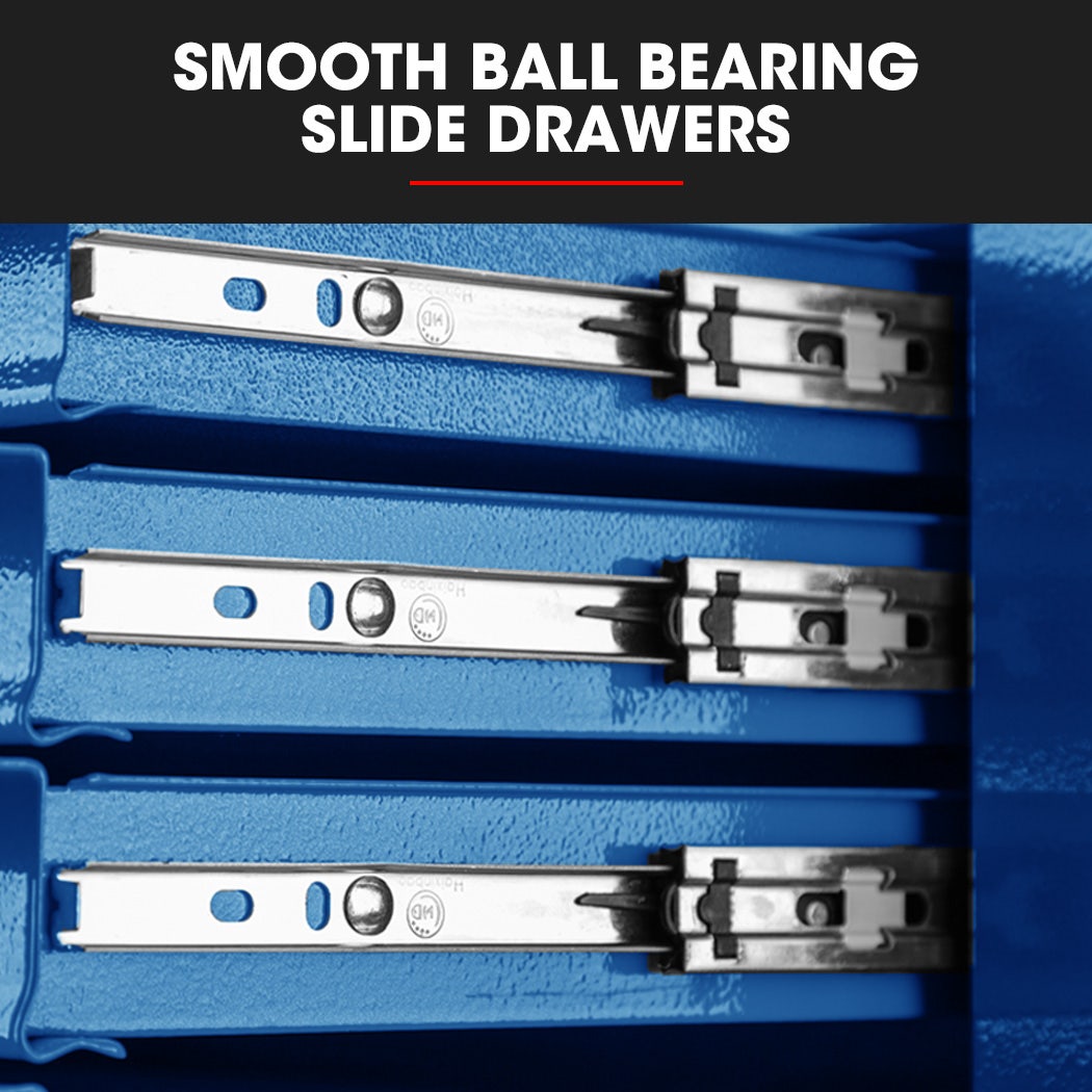 The chest is built with a high tensile powder coated steel enclosure. Each drawer slides effortlessly in and out on smooth ball bearing rails, which makes finding and accessing each tool a cinch, and each drawer contains an EVA mat to protect the tools. The unit is easily transportable, thanks to its side carry handles.