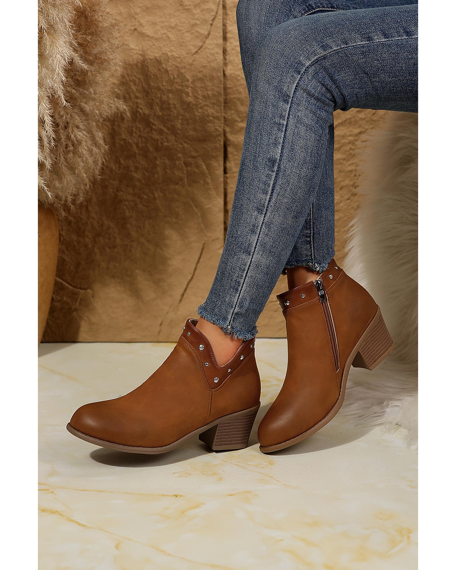 Chestnut Studded Faux Leather Chunky Heel Ankle Boots - 42 EU