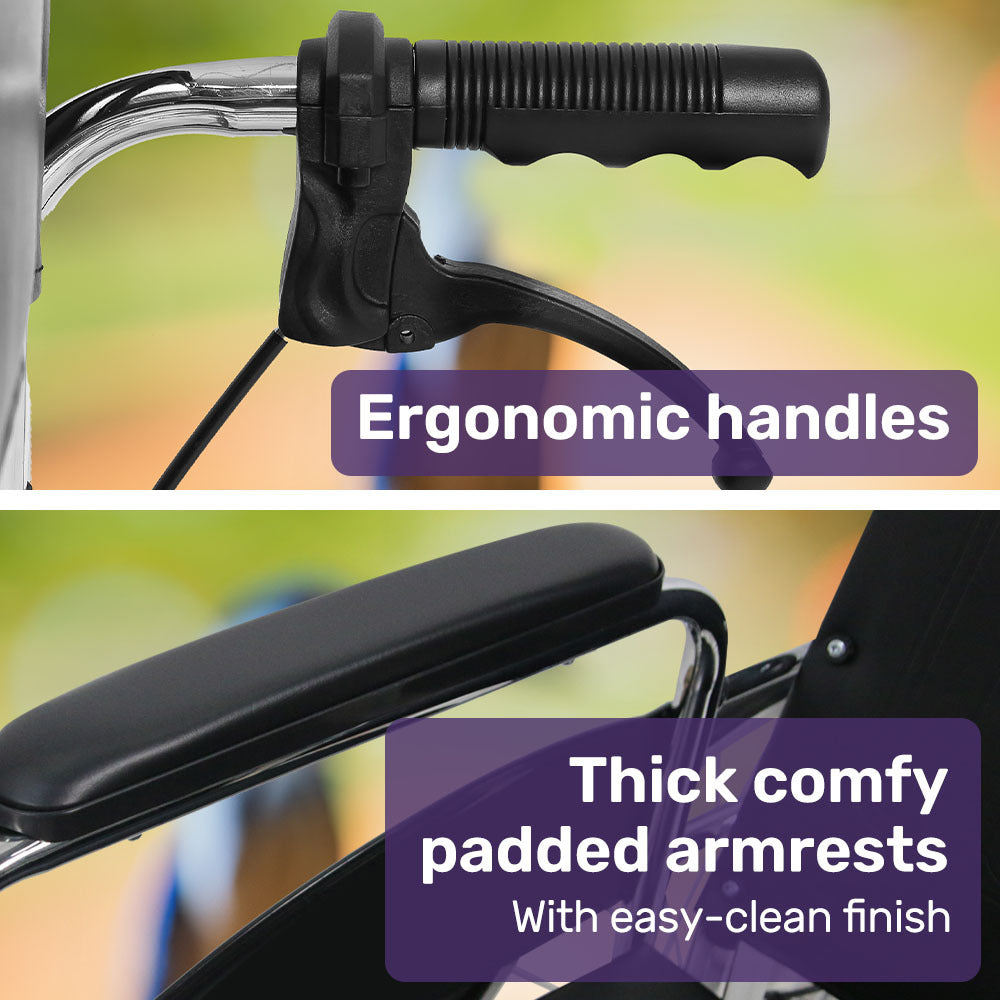 Dual parking brakes can securely lock the wheels in placea perfect time to pull out some reading material from the backrest pouch! The armrests are removable for convenient table access during meals. The wheelchair can be folded in seconds, and with ergonomic handles it is a relaxing day out for carers as well!