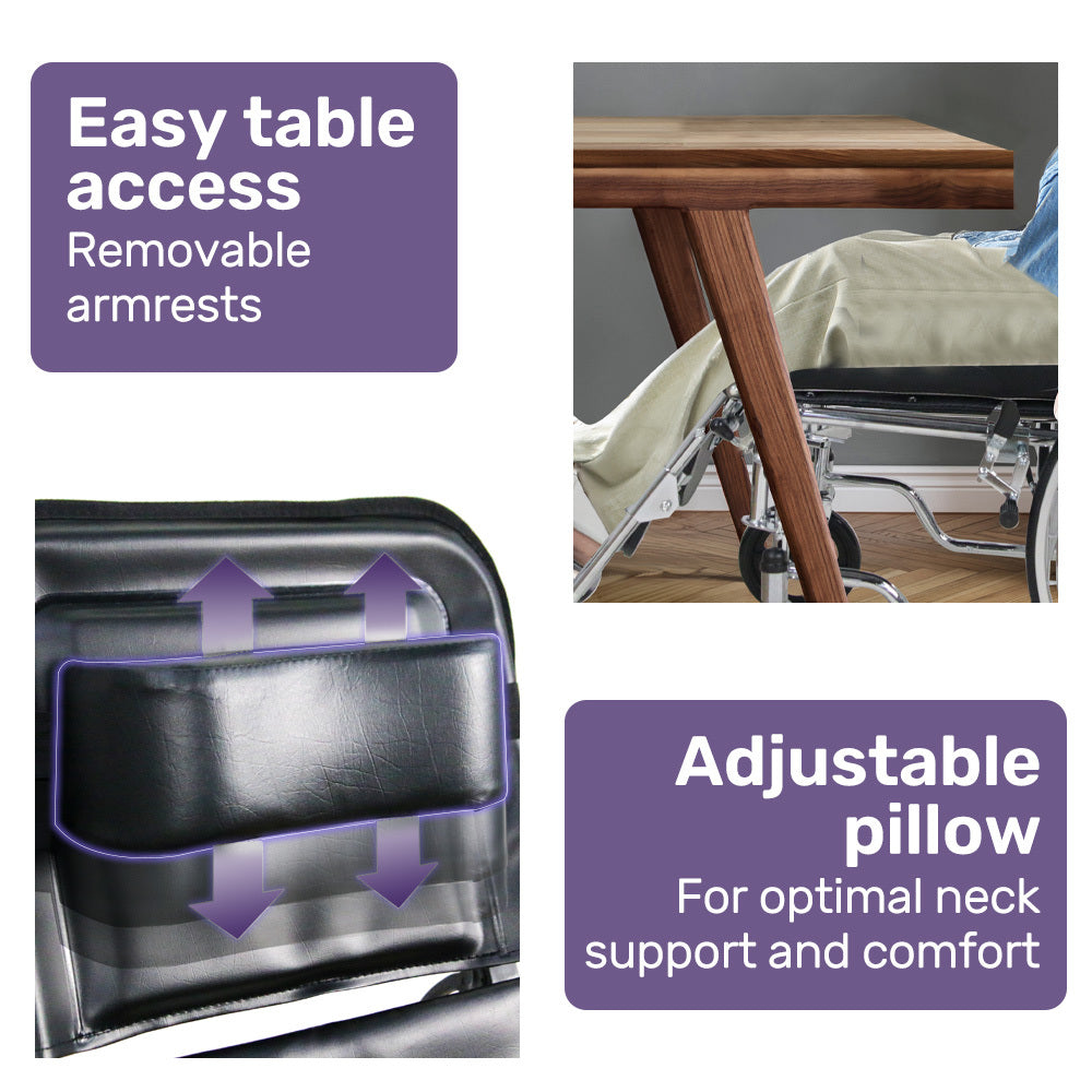 It features plush armrests, padded leg supports, generous seat width and thick cushion to ensure a comfortable journey. For added comfort, an adjustable pillow provides neck support. For a ride that is perfectly tailored to the passenger, the backrest can be adjusted between 7 angles by a carer using the quick adjust handle levers.