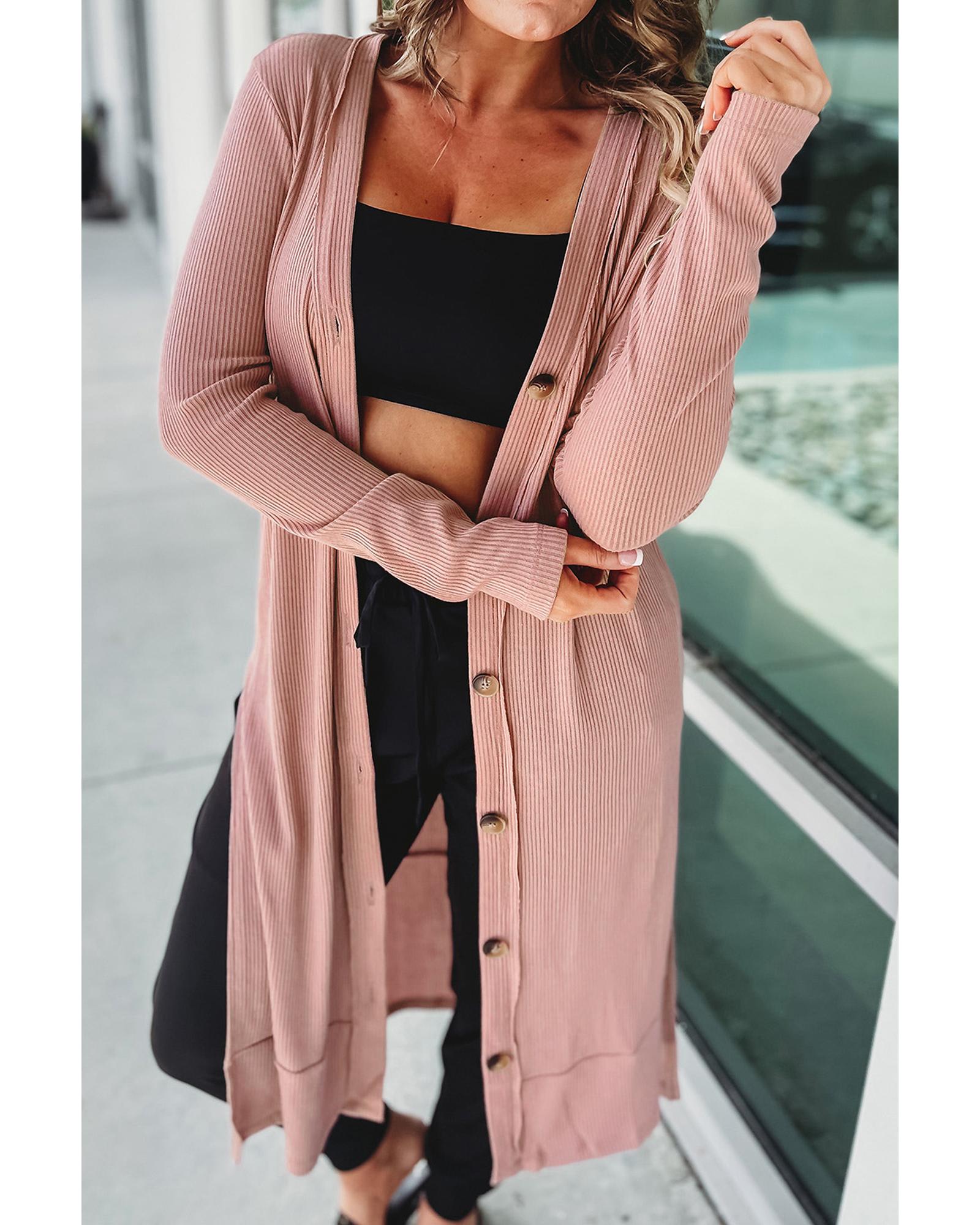 Pink Ribbed Button-Up Split Duster Cardigan - S