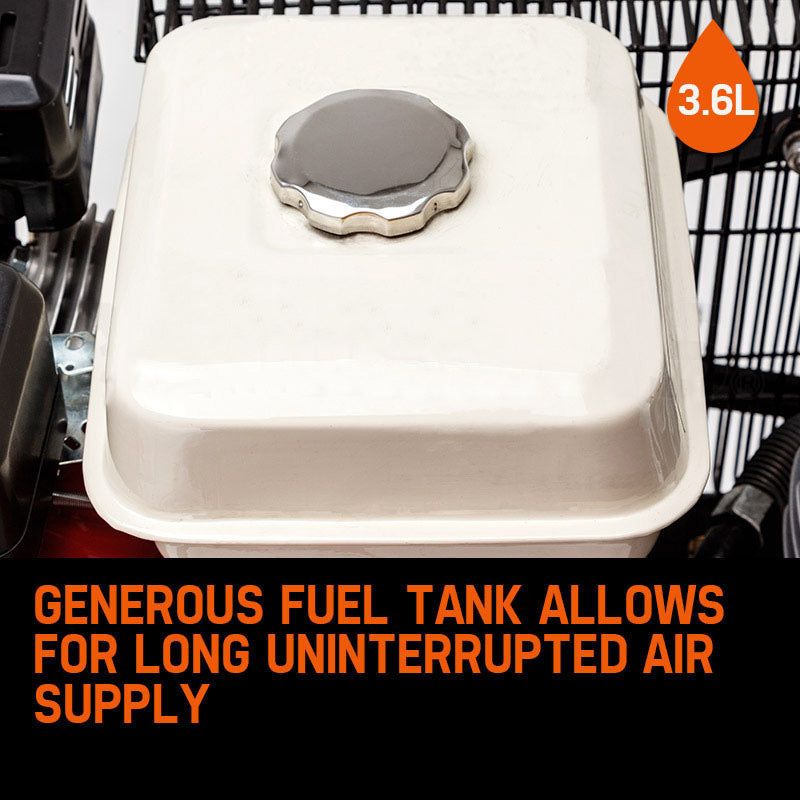 This impressive unit is powered by an ultra dependable 8HP petrol powered OHV engine. Couple this with the oversize 120L receiver and you've got a workhorse that has the ability to deliver 477 litres per minute of free air, all whilst maintaining a strong 115PSI even under the most demanding load! With a large 3.6L fuel tank and huge free air capacity, you will not find a better option for uninterrupted air supply