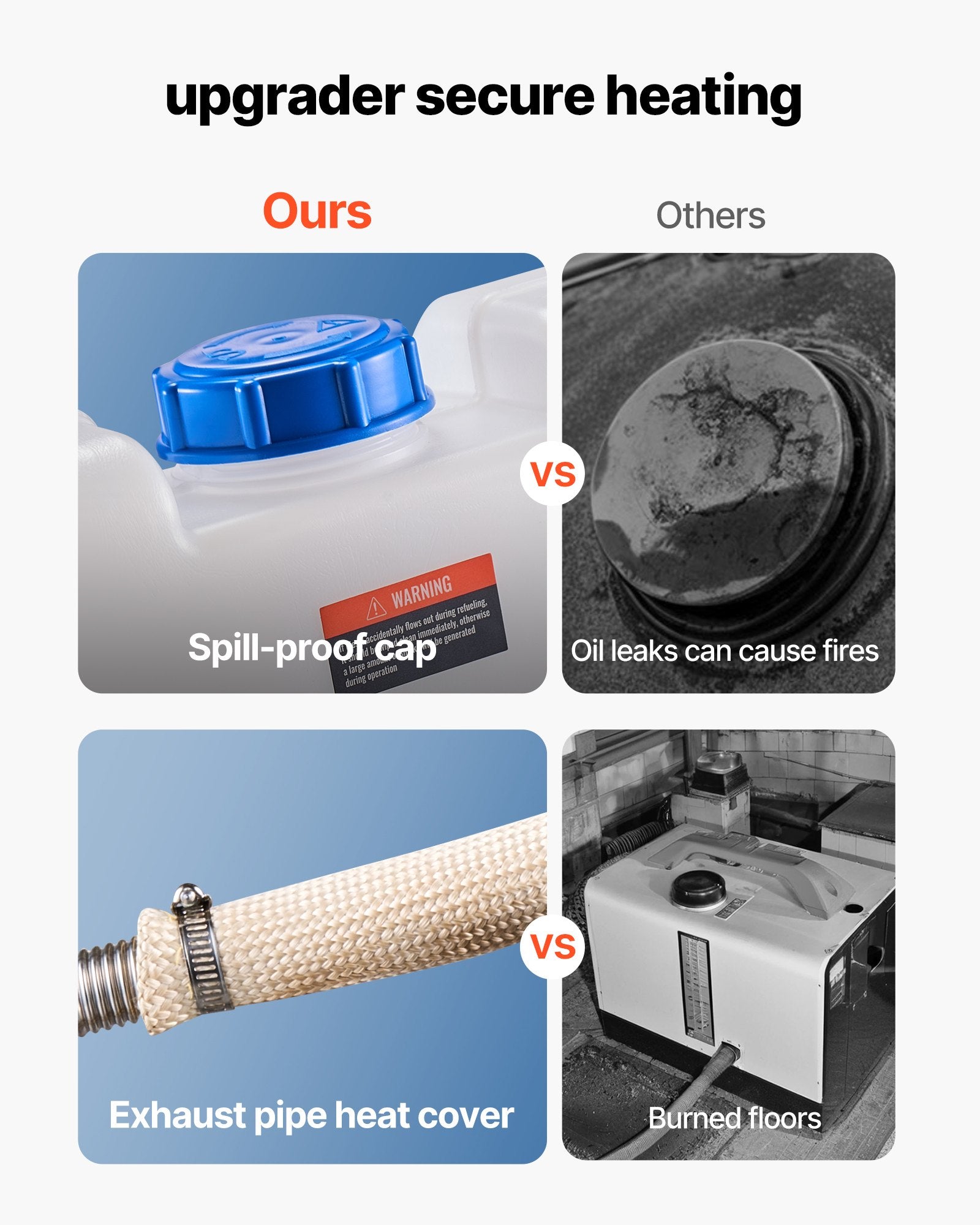 This diesel air heater features exhaust pipe heat sleeve to reduce floor damage risks. The sealed fuel cap ensures secure long-term use. Built-in protections include overheat shutoff (≥536℉), reverse polarity, and overvoltage