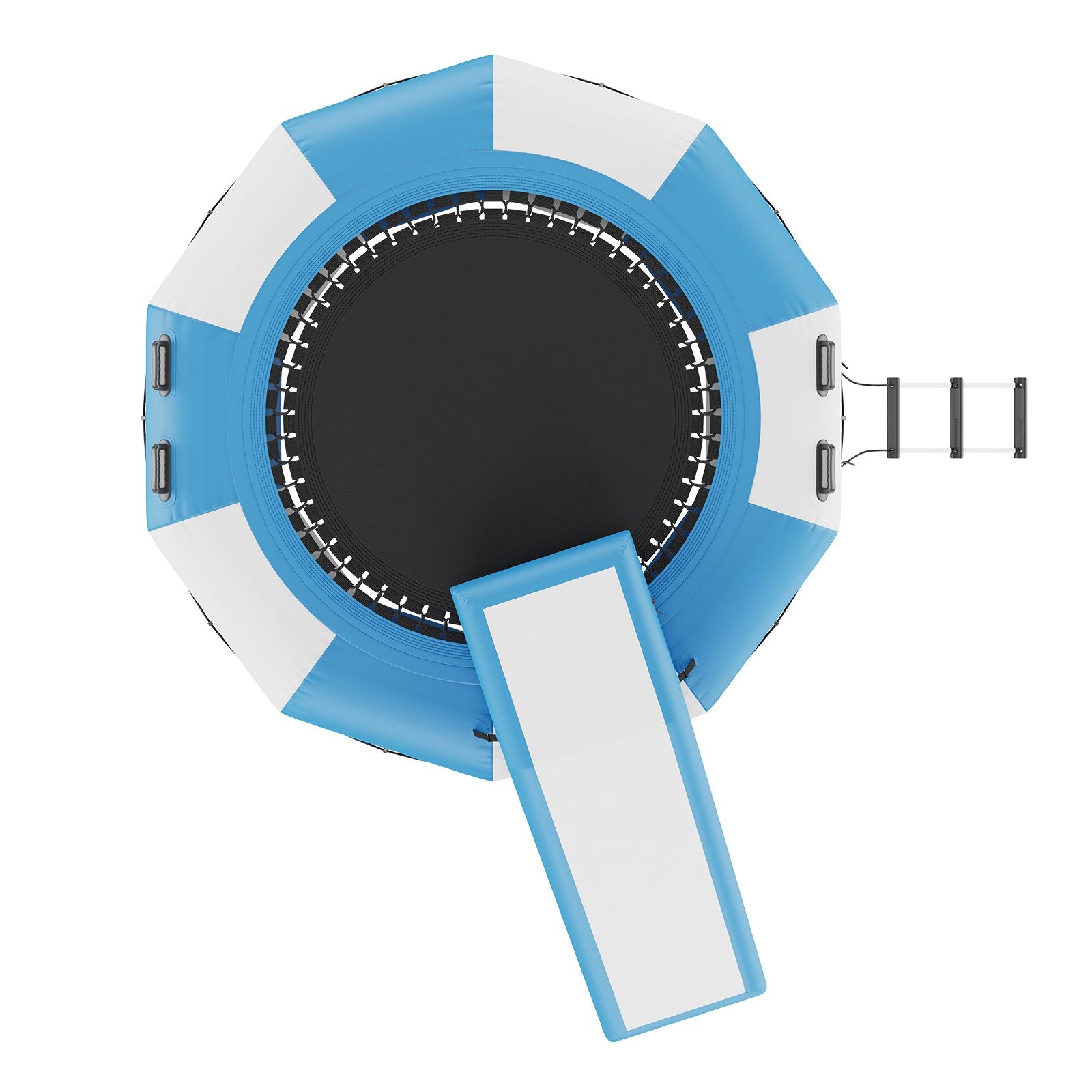 The trampoline comes with complete accessories, including anchor ropes*1, anchor bags*1, patch stickers*3, 3-step ladder*1, air nozzles*5, a reversible air pump*1, slide*1. The installation and usage process are straightforward. With built-in handles, moving it is convenient. The included anchor bags and 304 metal anchor buckles help secure it in place. The floating trampoline can be placed on any water surface, such as lakes, oceans, swimming pools, etc. Be cautious to avoid sharp objects.