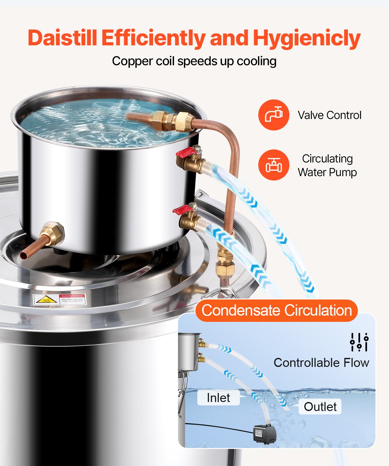 The cooling and distillation process uses copper tube with good thermal conductivity to accelerate cooling. The smooth and wrinkle-free interior of the pipes prevents residues of distilled alcohol and water, ensuring no aftertaste. A water pump facilitates cooling water circulation for thorough and efficient cooling.