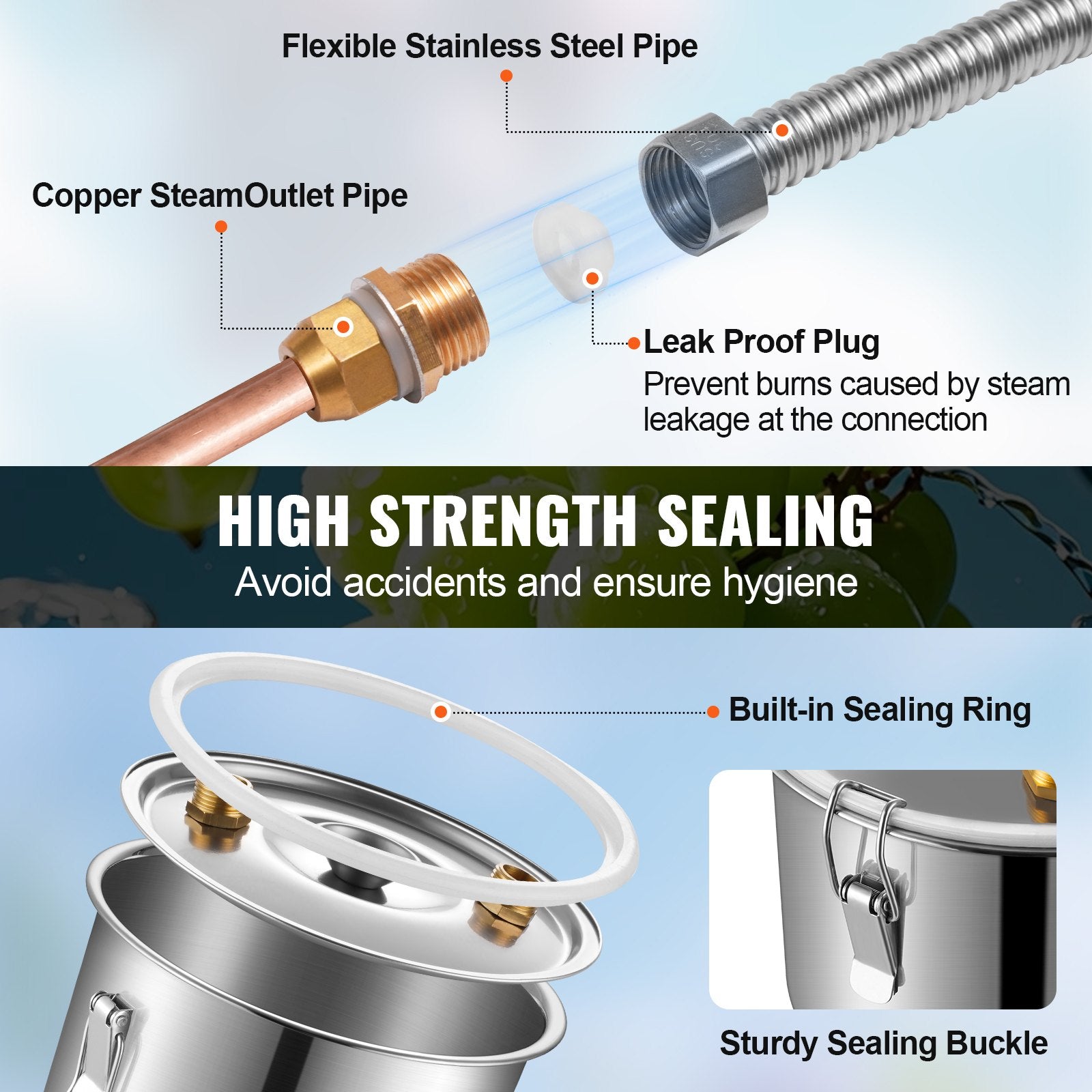 Silicone leak-proof plugs are added at the corrugated pipe joints to prevent leaks of water vapor, reducing the risk of burns and other injuries. Use a wrench to tighten connections securely during assembly. The fermentation barrel lid features four fixed sealing latches with built-in seals, ensuring hygiene and optimal fermentation results.